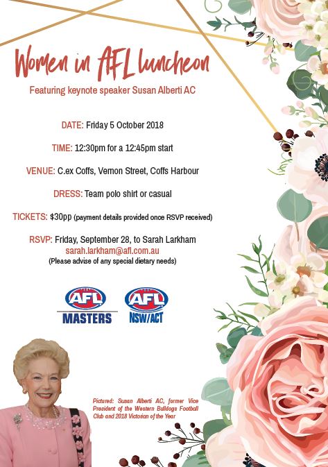 The inspirational Susan Alberti AC is set to be keynote speaker at the Women in AFL luncheon to be held at C.ex Coffs on Friday 5 October.