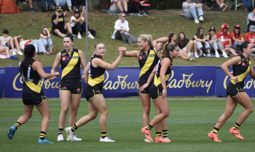 RICHMOND produced an almost unstoppable first quarter to set up a convincing victory over the Sydney Swans in the first elite level match played for premiership points in Coffs Harbour. Led by captain Katie Brennan who kicked three first first