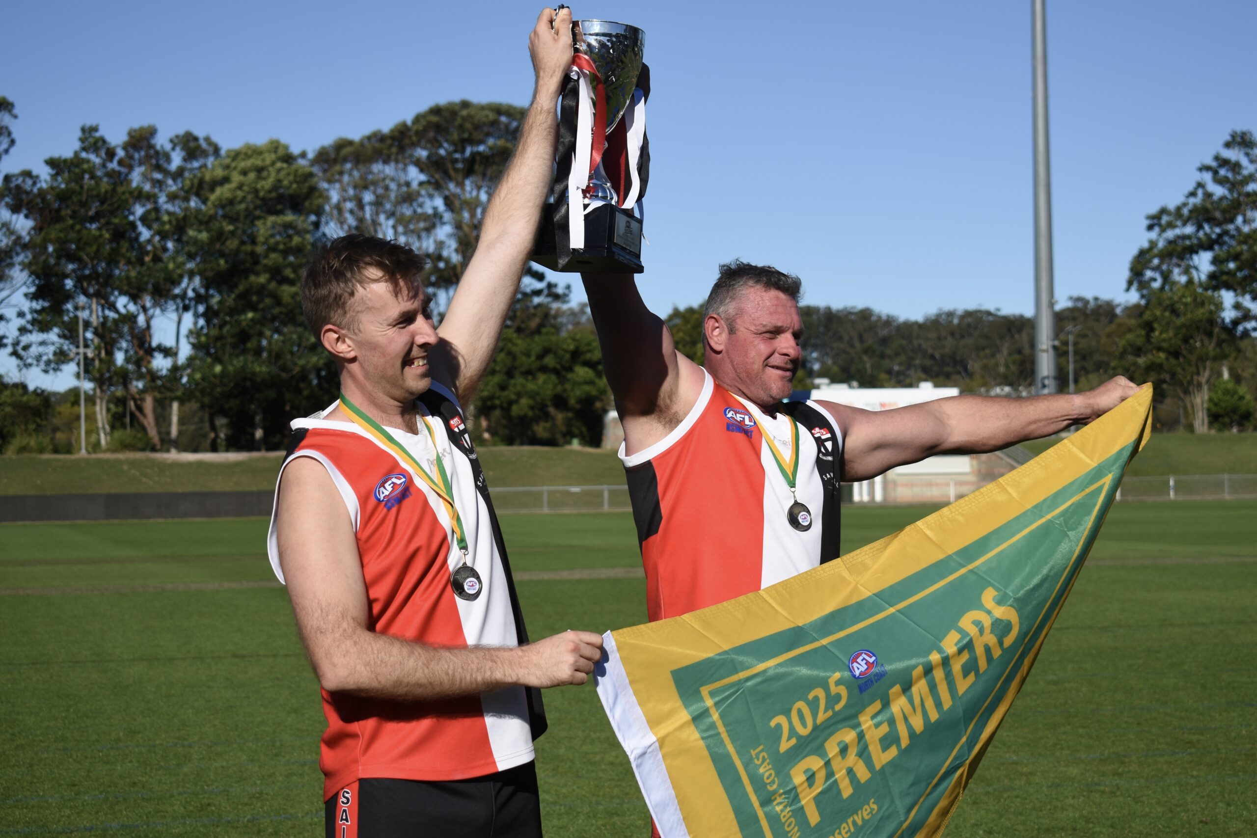 Tom Christos and Mark Couzens with the spoils of the 2025 AFL North Coast Reserves premiership that Sawtell/Toormina won. Photo: Brad Greenshields